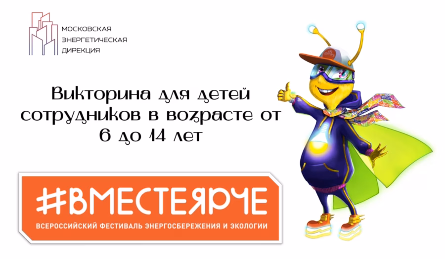В субботу,10 октября 2020 года в рамках Всероссийского фестиваля энергосбережения и экологии #ВместеЯрче – 2020 прошла онлайн-викторина для детей сотрудников возрасте от 6 до 14 лет. Темами игры стали теплоэнергетика, экология, электричество, ресурсы и другие.